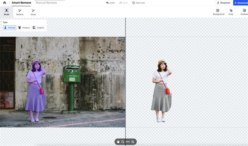 基本上他的抠图能力还算可以,大概有 80~90 分,但有个不错的地方是,它的抠图不只是针对人像,左上角的 Mode 里可以选择人像、产品或是图形来做识别基准,比起一般都只针对人像的工具是更加实用的。